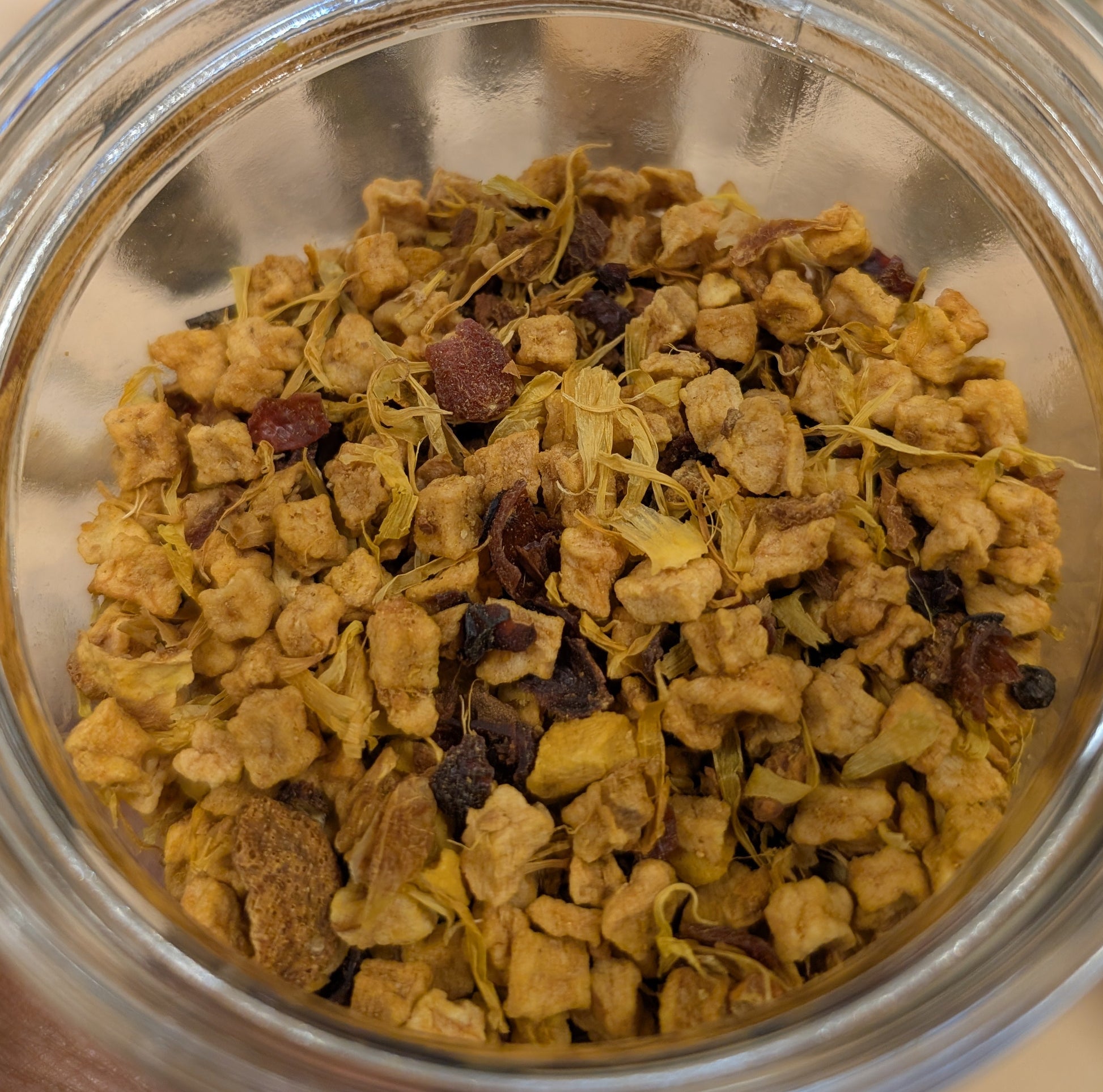 Let your cup glow with Golden Goodness — a radiant herbal tisane that captures the warmth of sunshine in every sip. This golden-hued blend combines the comforting spice of cinnamon, ginger, and turmeric with the bright sweetness of apple, mango, and orange, balanced by soothing rose hips and marigold petals for a touch of floral calm.